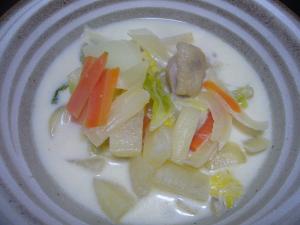 仕上げに牛乳と生クリームを加え、沸騰しないように温めたら完成。 |