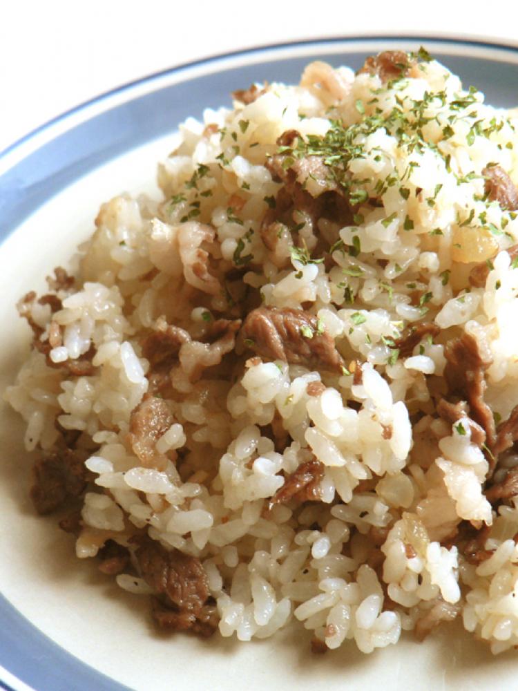 牛肉を追加、火が通ったらごはんも追加して炒める。