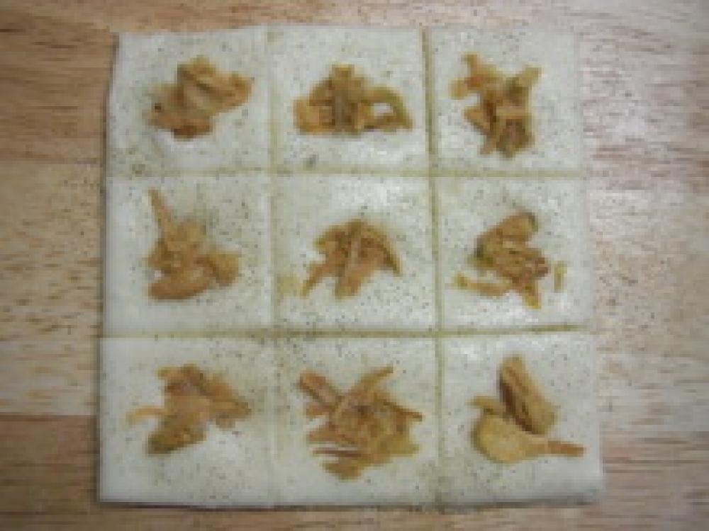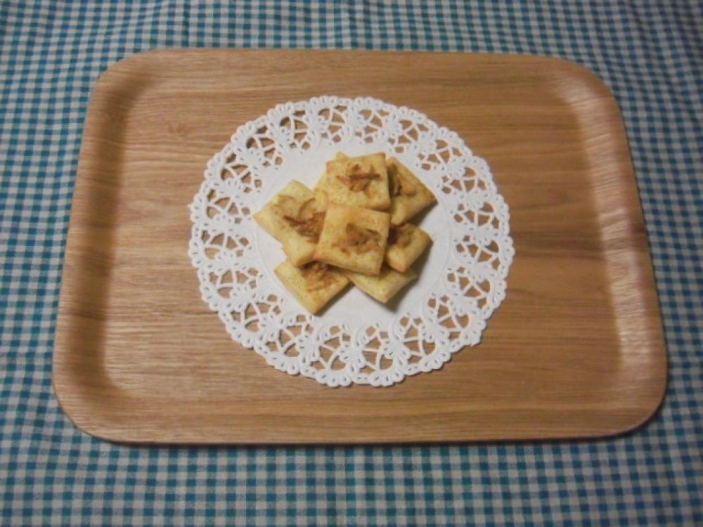②の生地を麺棒で厚さ4~5mmくらいに伸ばし、端を切り落とし、3㎝角に切る。