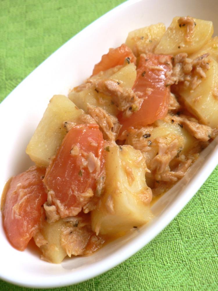 じゃがいも、トマト、ツナの順に追加し、塩コショウで味を調整、最後にオレガノを散らして完成!