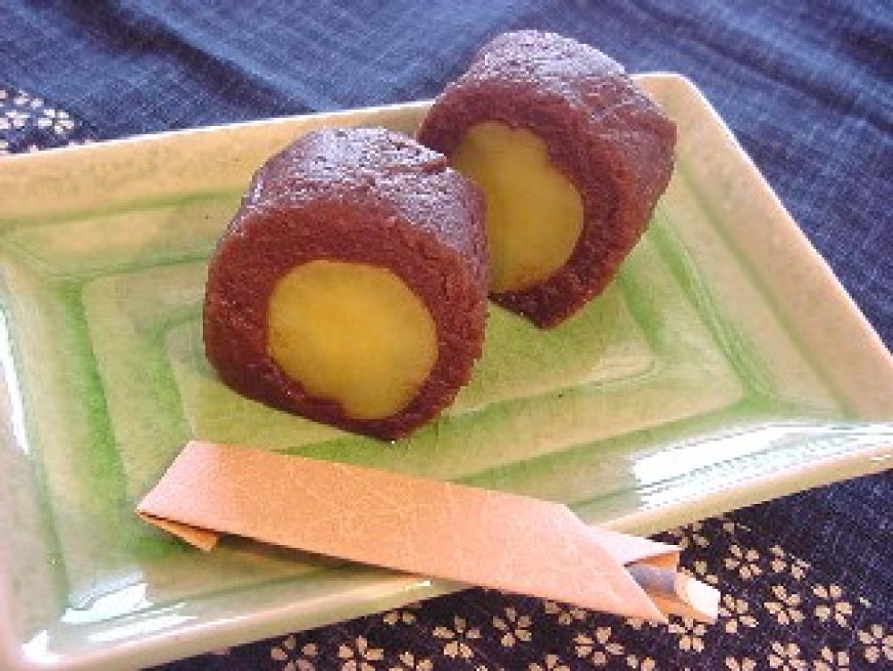あんの粗熱が取れたら、ラップに半量をしき、さつまいもを芯にしてまく。