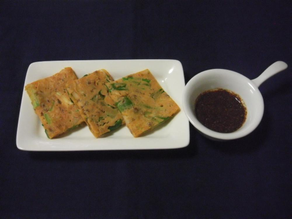 ①にキムチ、納豆、万能ネギを加え混ぜ、分量外のゴマ油をしいたフライパンに、直径7cmほどに丸く生地を流し込み両面を焼く。