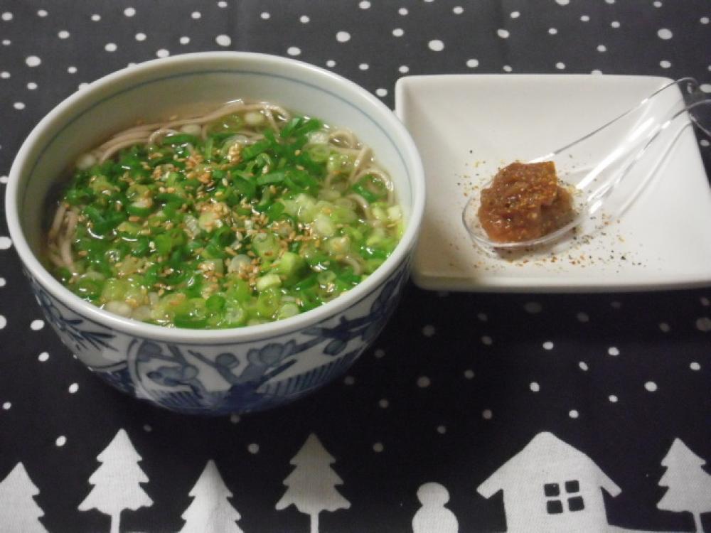蕎麦を茹で、温めた③スープと一緒に盛り付け、万能ネギ、白いりゴマを散らす。