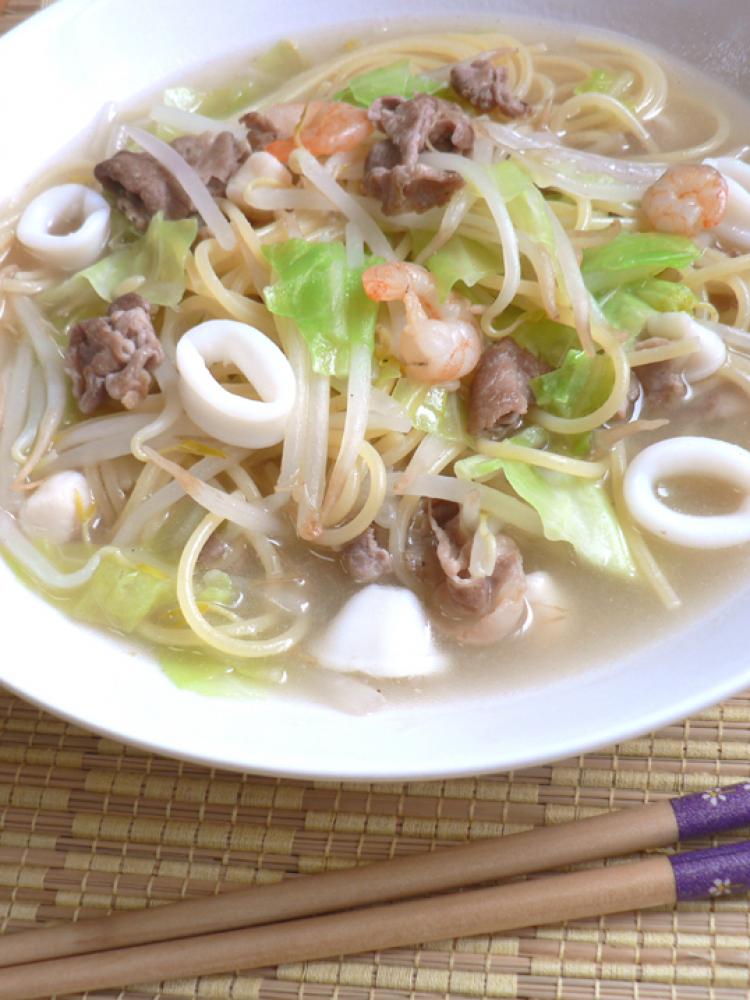 パスタは少し固めに茹でる、豚肉や野菜は食べやすく切っておく。
