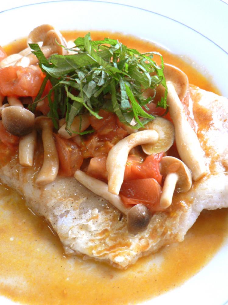 バルサミコと塩コショウで味を調整したら、たらの上に盛り付ける。最後に千切りにした大葉を散らして完成!