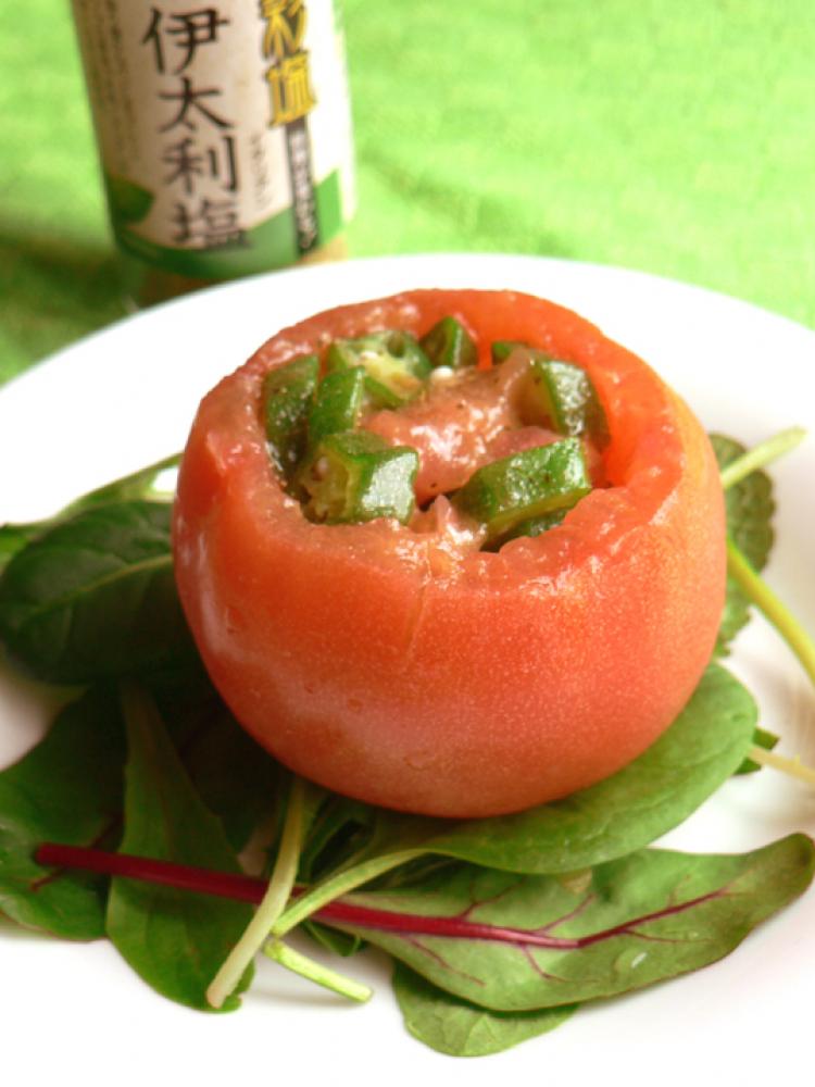 くり抜いたトマトとオクラに、伊太利塩とオリーブ油を混ぜる。トマトの器に盛り付けたら完成!
