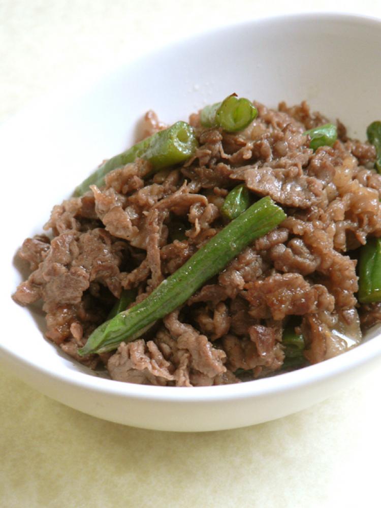 フライパンに油小さじ1、食べやすい大きさに切った牛肉を炒める。