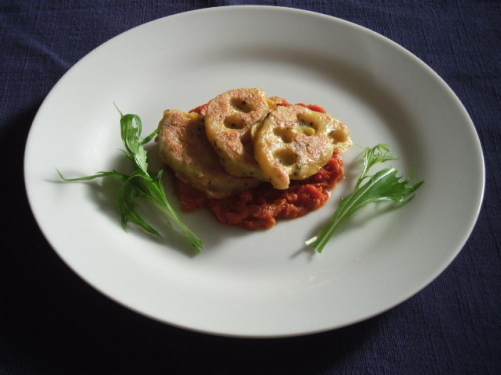 ③のれんこんピカタと⑤のソースを盛り付ける。