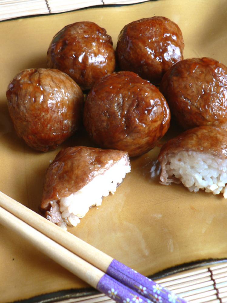 牛肉薄切りで「1」を巻き、片栗粉の上でコロコロ。