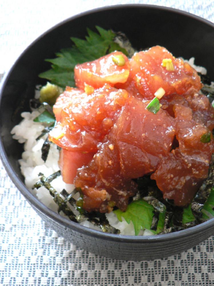 マグロは刺身くらいの厚さに切り、ゴマはよくすっておく。Aを混ぜ合わせた<漬けダレ>に1時間ほど漬けてる。