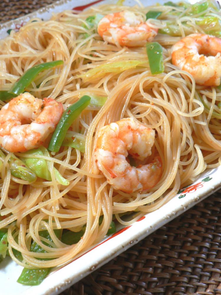 熱したフライパンにおかずラー油を小さじ1、「1」、えび、ビーフンの順に乗せる。
