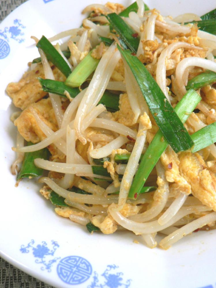 ニラはざく切りに、もやしは水洗いしてザルに取る。