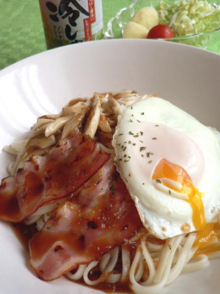 冷やしたうどんに「1」「2」をのせドレッシングをかけて完成。