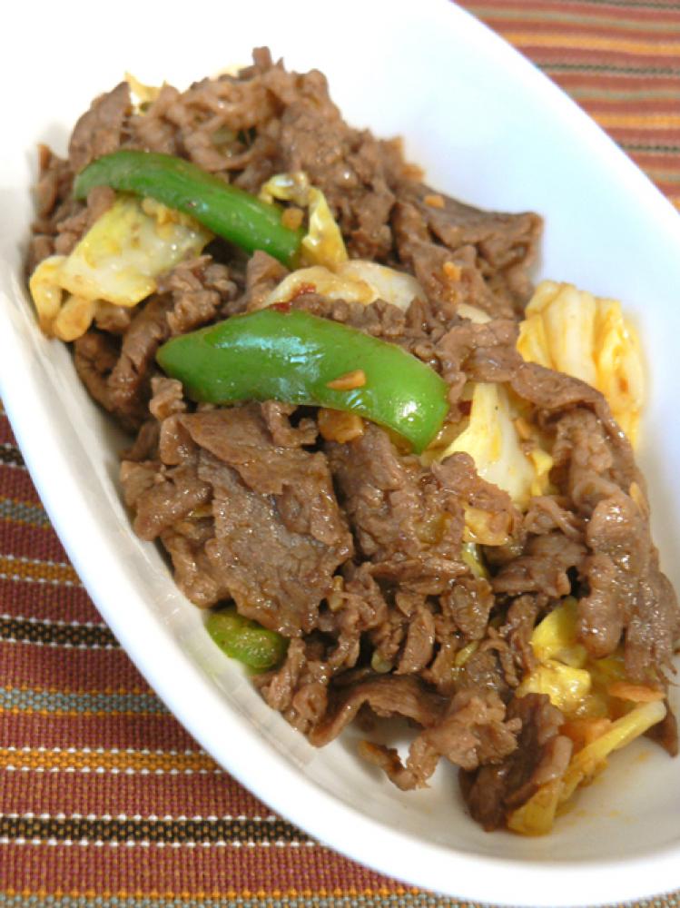 フライパンに油小さじ1、牛肉に塩コショウして炒める。ーマン、キャベツの順に追加して全体を炒める。