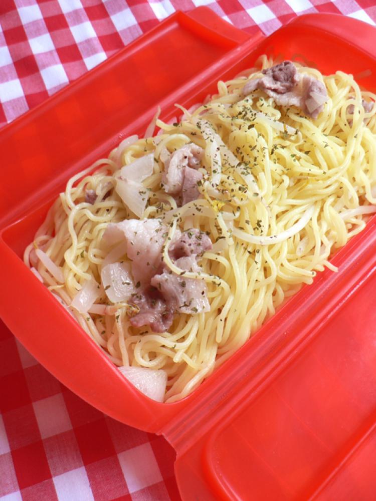 取り出したルクエに麺とコンソメスープを追加。600wのレンジで2分チンすれば完成!
