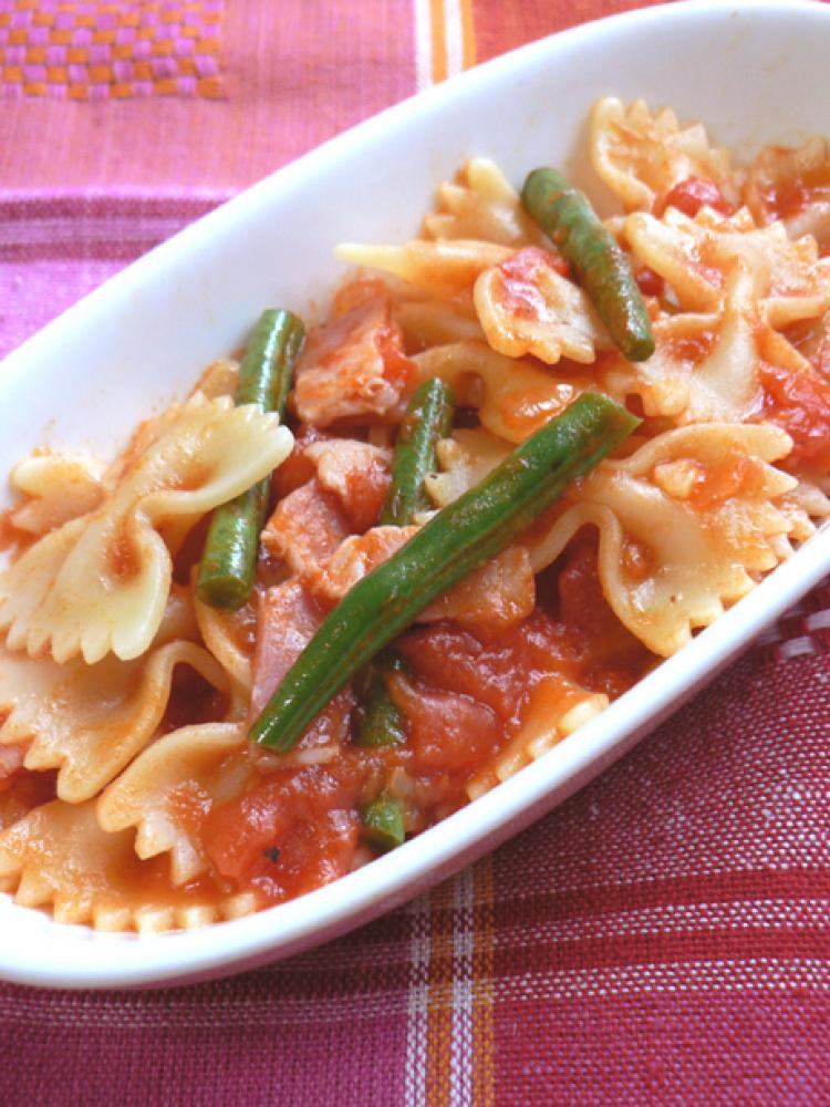 ベーコンといんげんは食べやすい大きさにカット。フライパンで炒める、ファルファッレは指定時間茹でる。