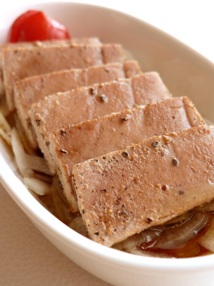 水気を切った玉ねぎをしいて、冷ましたマグロ、トマトを並べる。Aを合わせた<ソース>を回しかけて冷やせば完成!