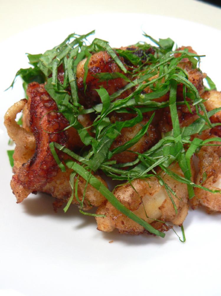 「2」を170℃の油でカリっと揚げ、刻んだ大葉を散らせば完成!