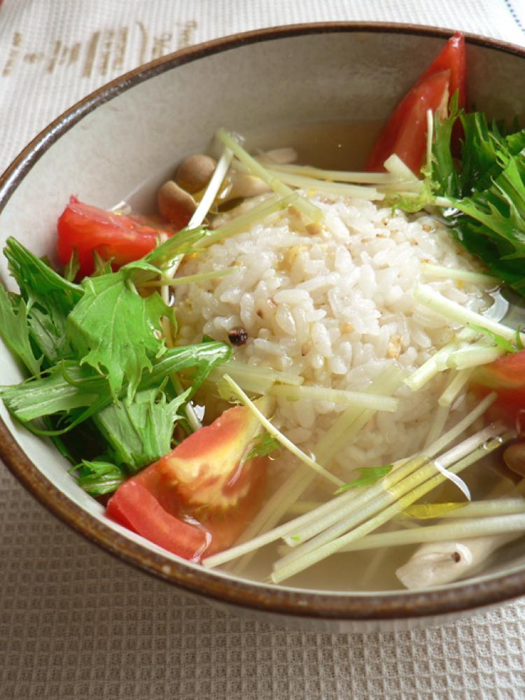 深めの器に玄米ご飯と野菜を盛り付け、スープとオリーブ油を回しかけたら完成!