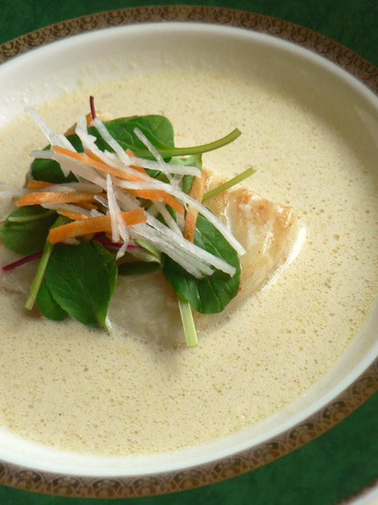 フライパンにAを合わせた<ソース>を追加して弱火で煮立てる。塩コショウで味を整えて、白身魚の皿に追加すれば完成!