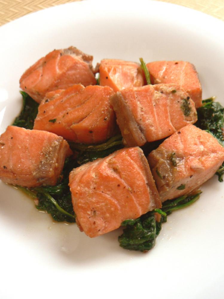 フライパンにサラダ油、サーモンに焼き目を付け別皿に取り出す。