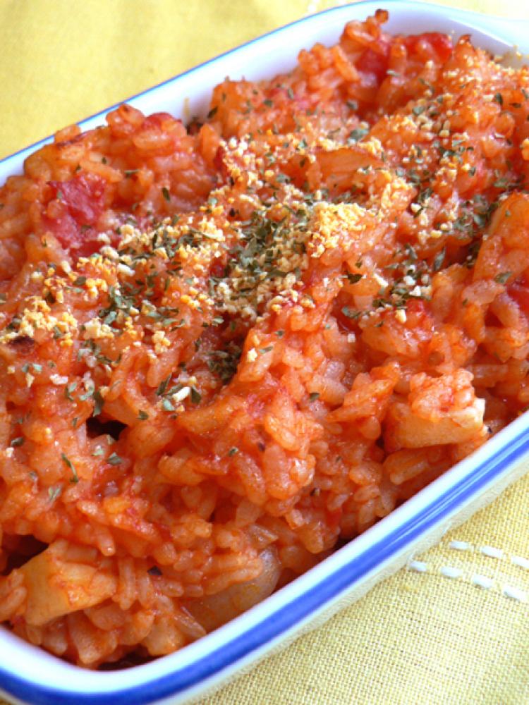 「2」にホールトマトとコンソメスープを追加、塩コショウで味付けし、ごはんを追加して中弱火で3分。