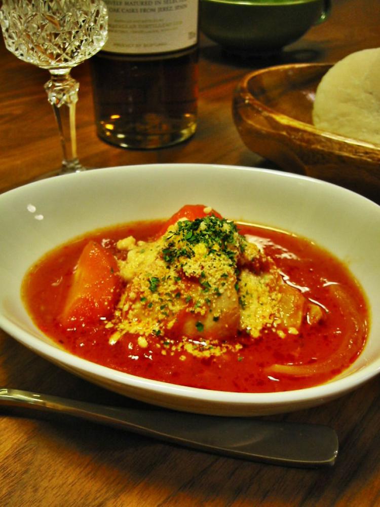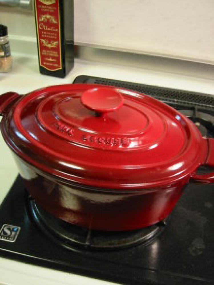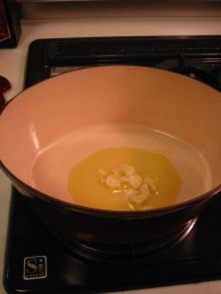 ![]() 鍋にオリーブオイル、にんにくを入れたら弱火にかけ、香りを引き出す。