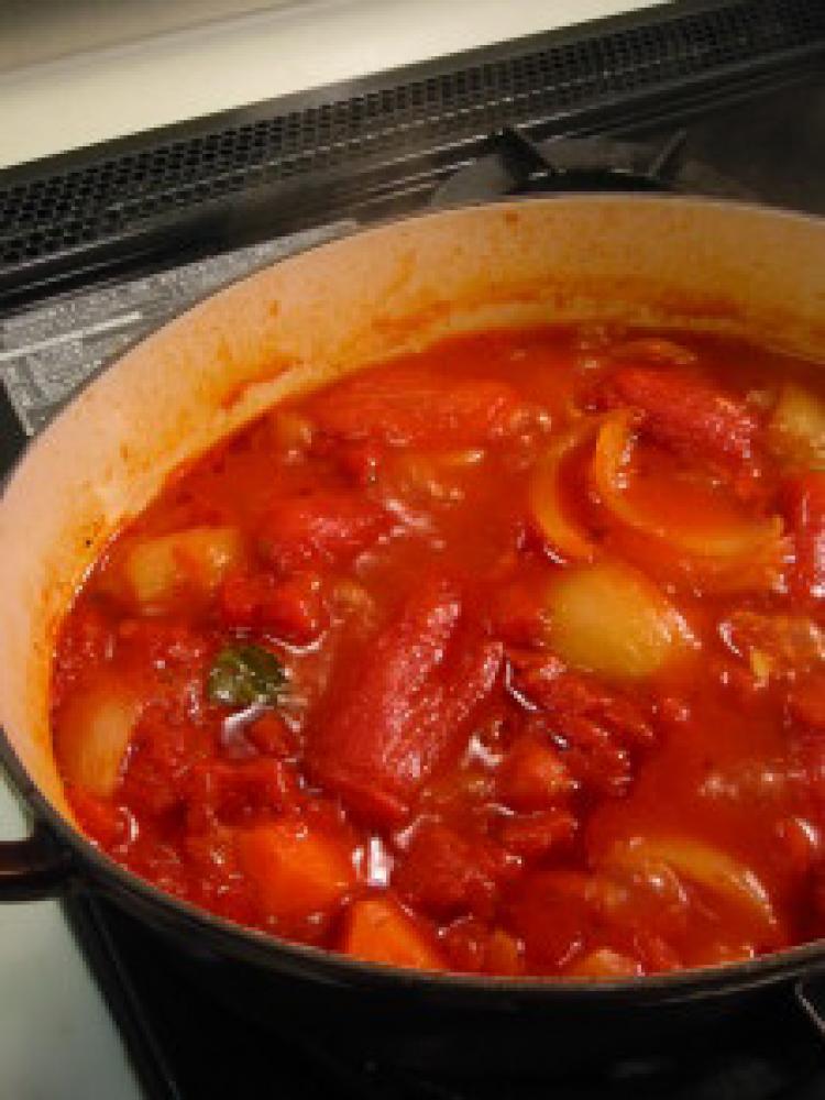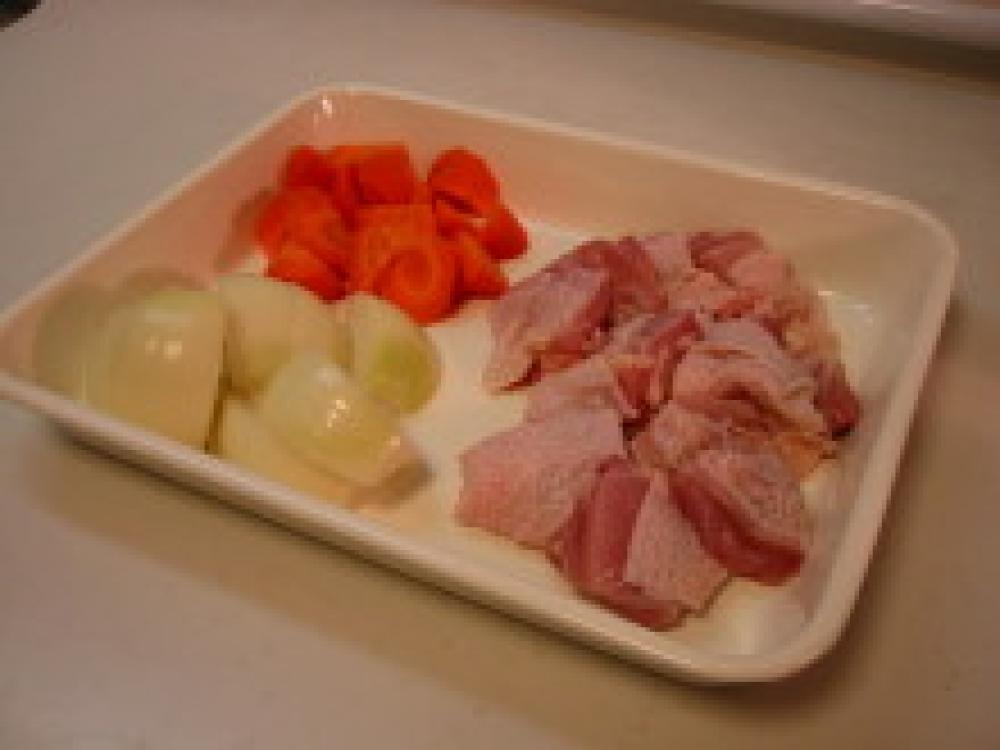 ![]() 鶏肉、人参、玉ねぎは食べやすい大きさに切る。にんにくはスライスする。