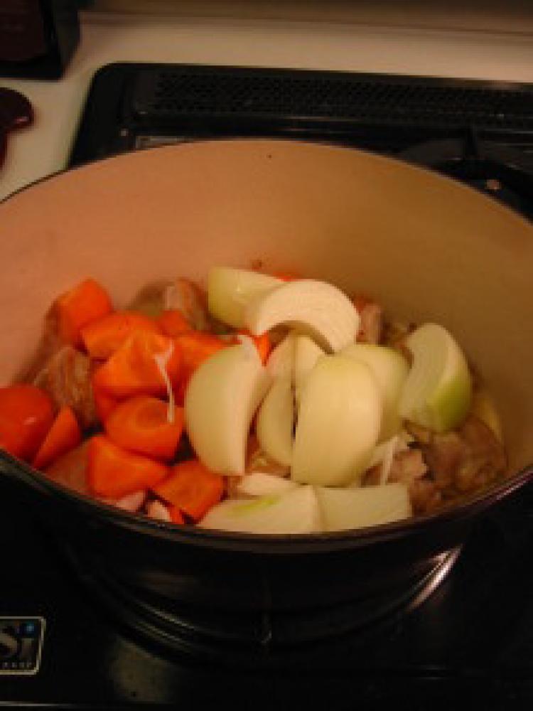 ![]() 鶏肉を加え軽く焼き色をつけたら、人参、玉ねぎも加え炒め合わせる。