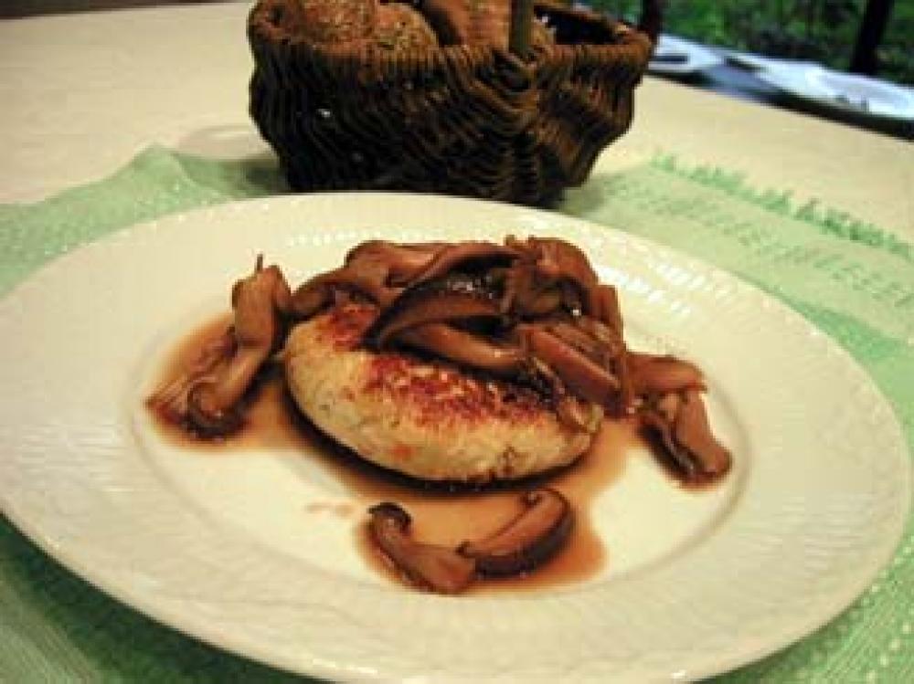 さらにハンバーグを盛り付け、上からきのこソースをたっぷりかける。