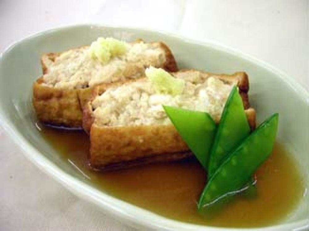 厚揚げを半分に切り、中身をスプーンで取り出す。玉ねぎはみじん切りにする。