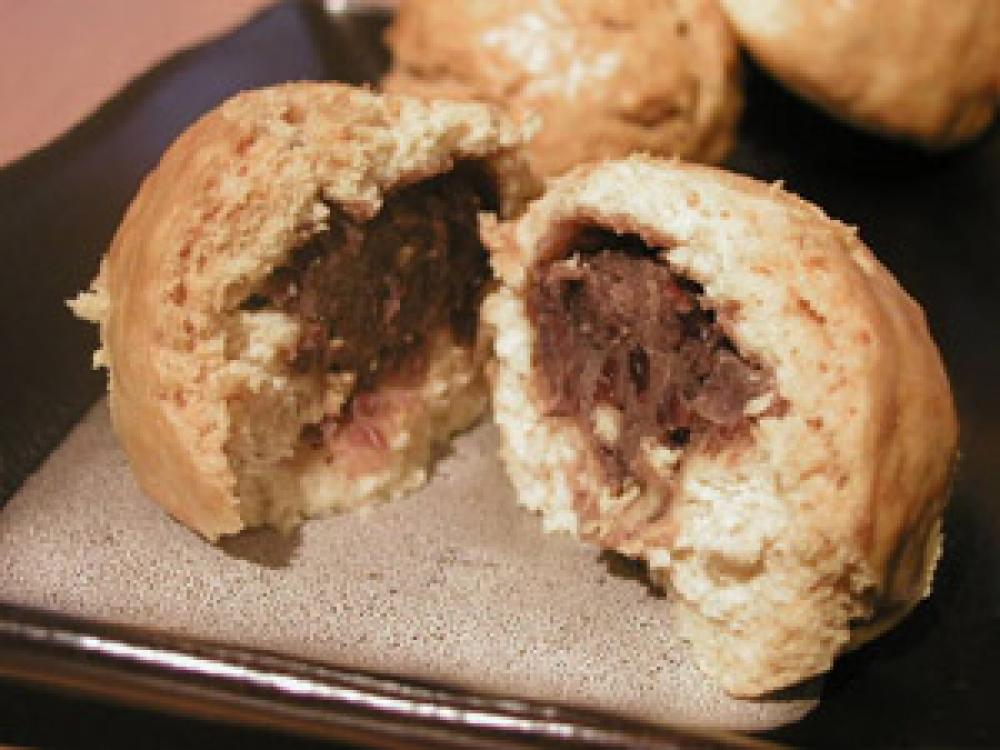 8等分にした生地を手で伸ばし、あんこをくるむ。