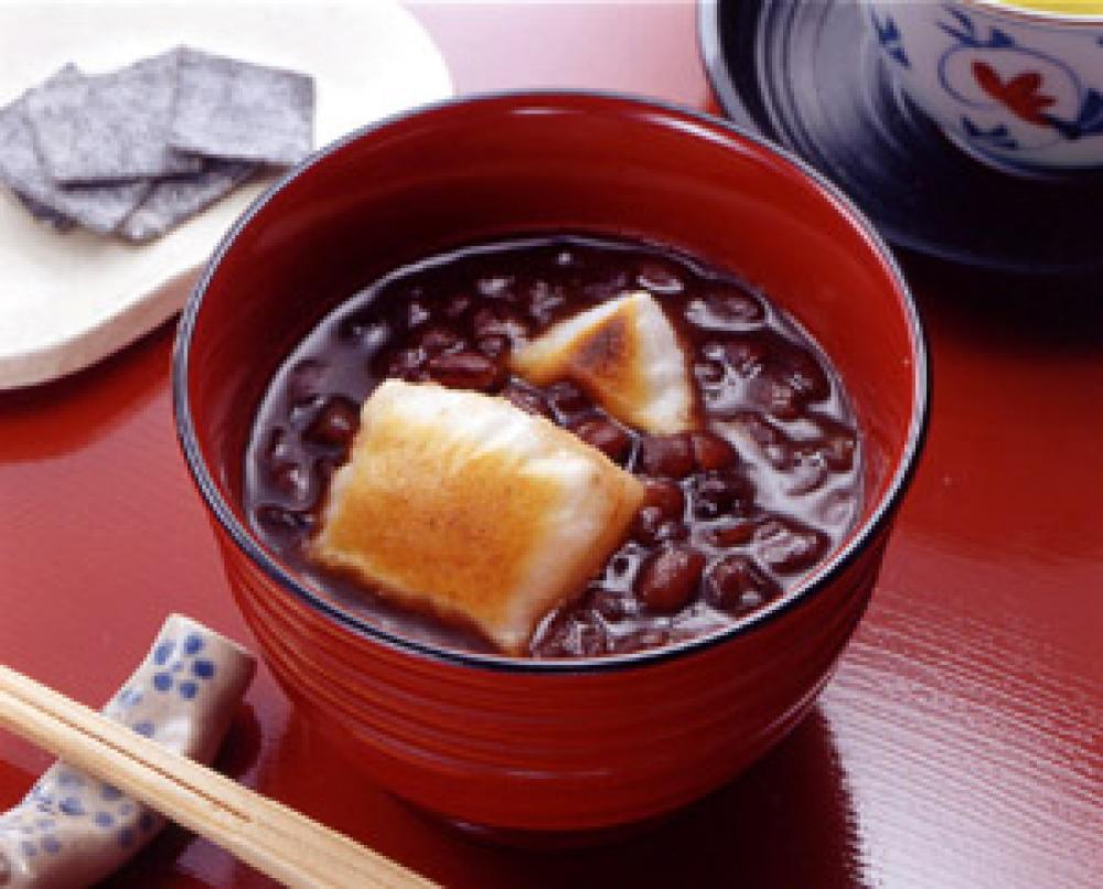 器に(1)を注ぎ入れ、(2)のもちをのせる。
