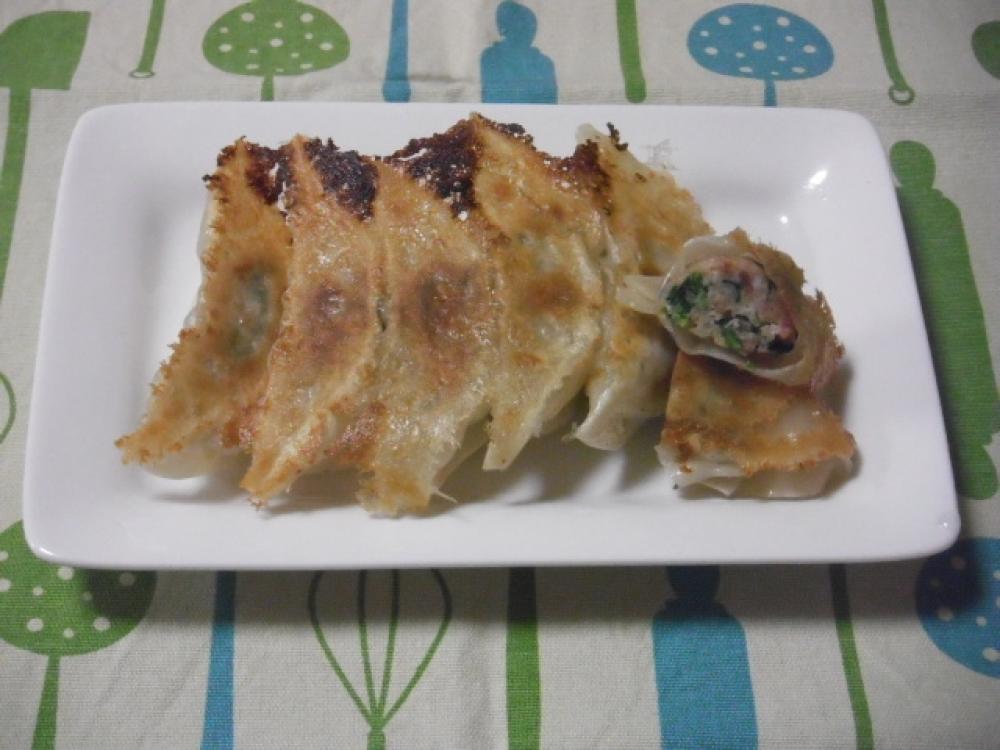 ![]() 餃子の皮で③の具を包み、分量外のサラダ油をしいたフライパンに並べ水と片栗粉を混ぜたものを注ぎ蓋をし中~弱火で5分焼く。