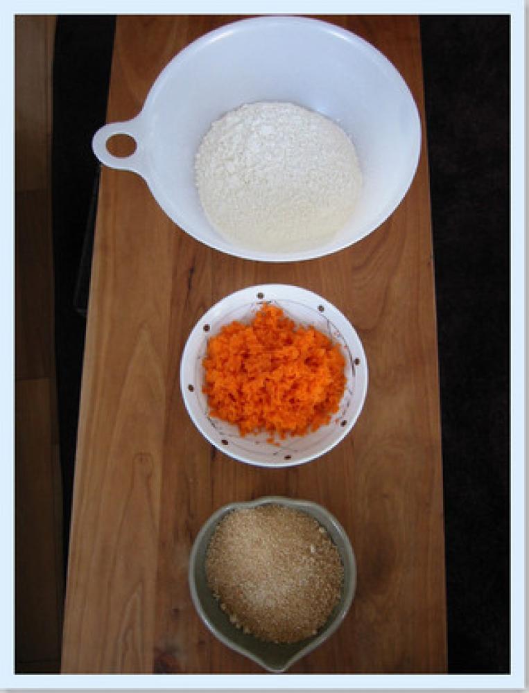 ![]() にんじんをすりおろし、カシューナッツは軽く炒ってから刻み、(A)は合わせてふるっておく。