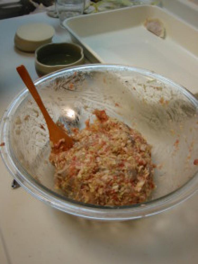 キャベツはみじん切り。豚こま肉の場合はたたいて粗めのミンチにし、エビは殻と背ワタをはずしてぶつ切りにする。