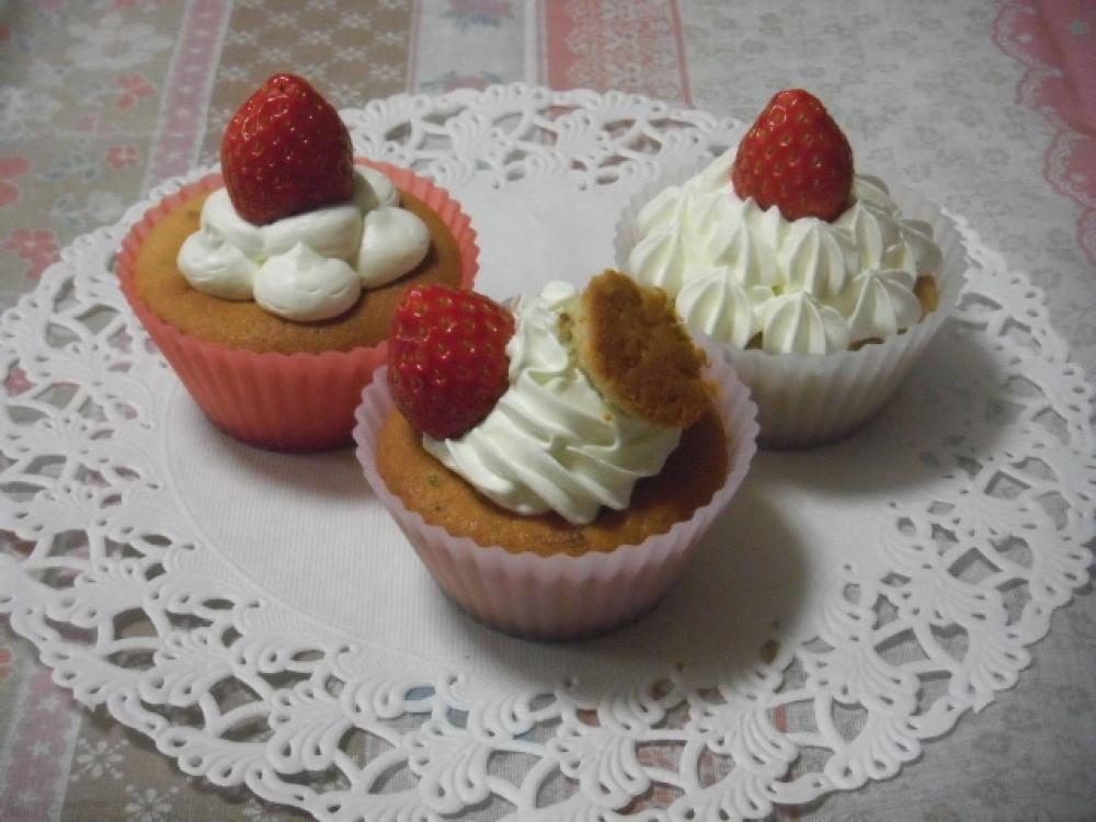 焼いたカップケーキはデコレーションするために、粗熱をとって冷ます。イチゴやホイップクリームでトッピング。
