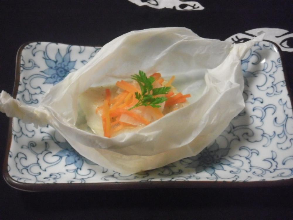 1が10分経ったら、余分な水気をふいて、クッキングシートにのせ、人参、タマネギとともに包む。