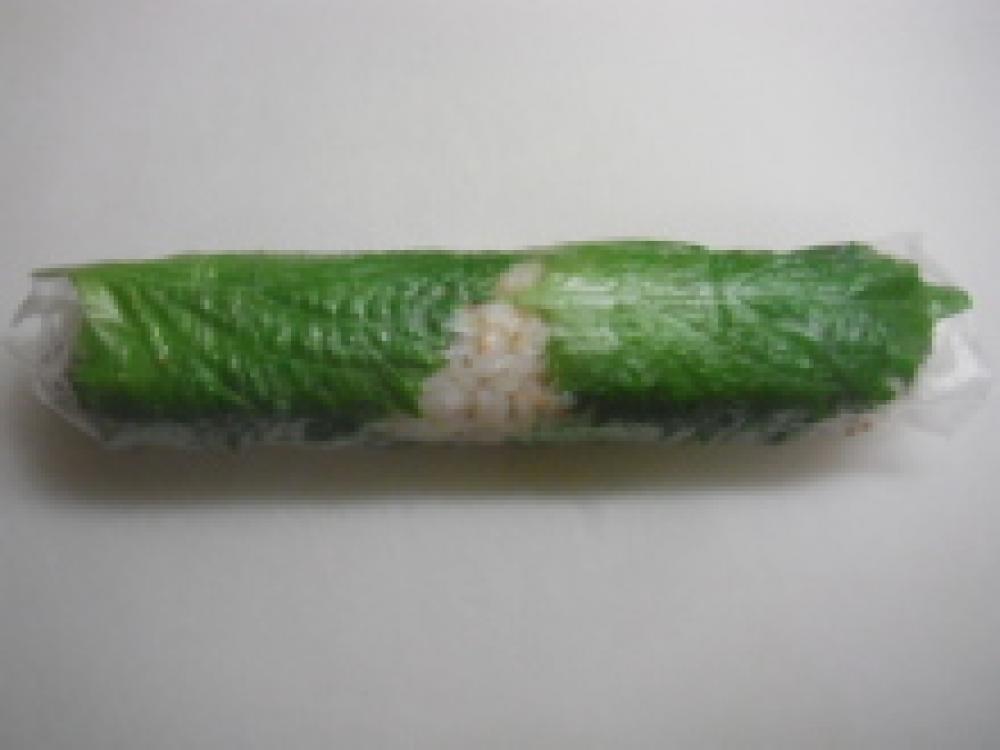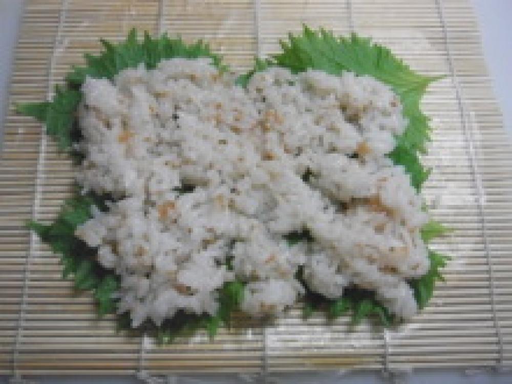 ![]() 2の上に青しそを裏面が上になるように置き、4枚並べる。