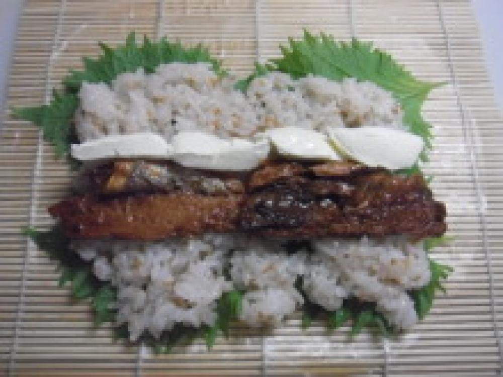 ![]() 4の上に、サンマの蒲焼き缶、クリームチーズを並べる。