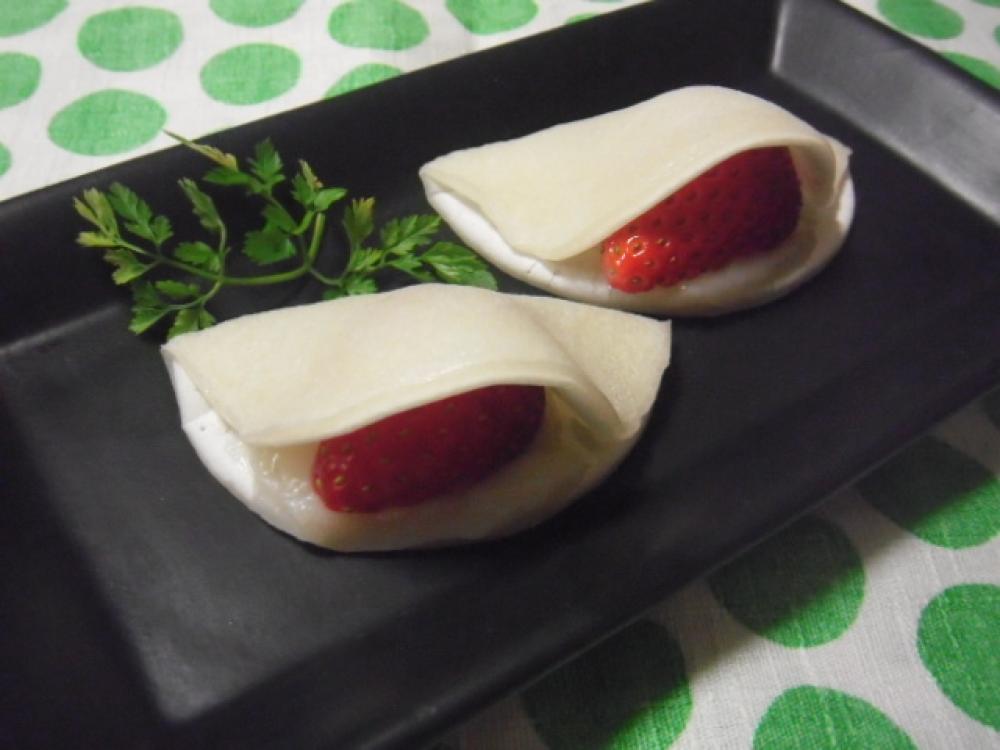 生地が冷めたら、半分に折るようにして、練乳白あんとカットしたいちごを挟む。