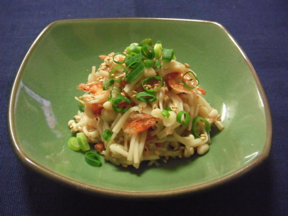 1の水気をとって、塩、ゴマ油、ガーリックパウダー、一味唐辛子、乾燥桜エビを混ぜる。
