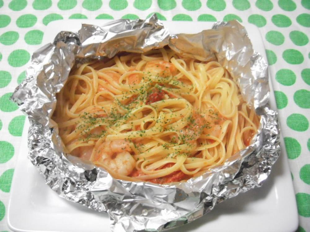 ゆでている間にフライパンに、ホイルシートをしいてオリーブオイル、ニンニクみじん切りを入れ、弱火で香りが出るように炒める。
