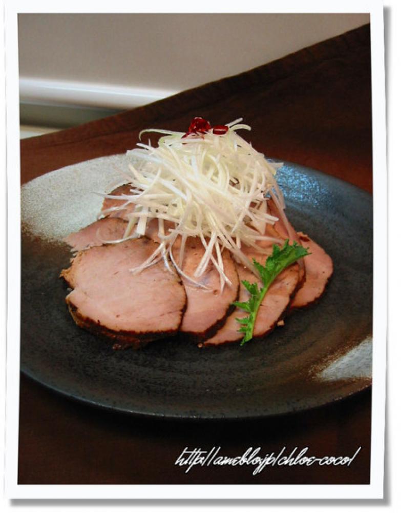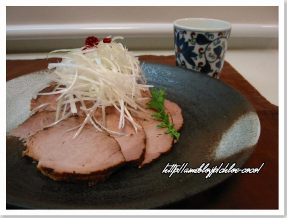 ![]() できあがったら薄くスライスし、白髪ねぎをのせる。