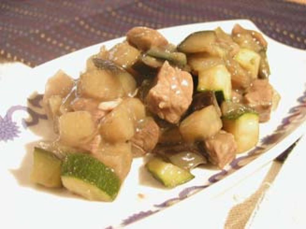 茄子、牛肉、ズッキーニはさいころ状に切る。