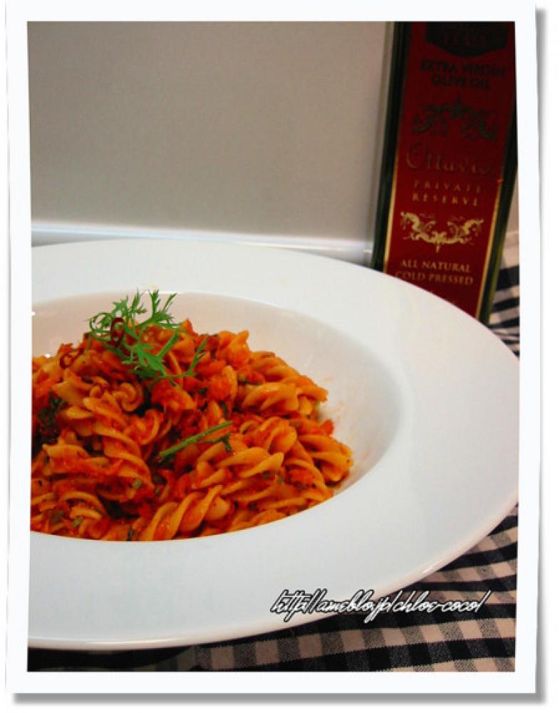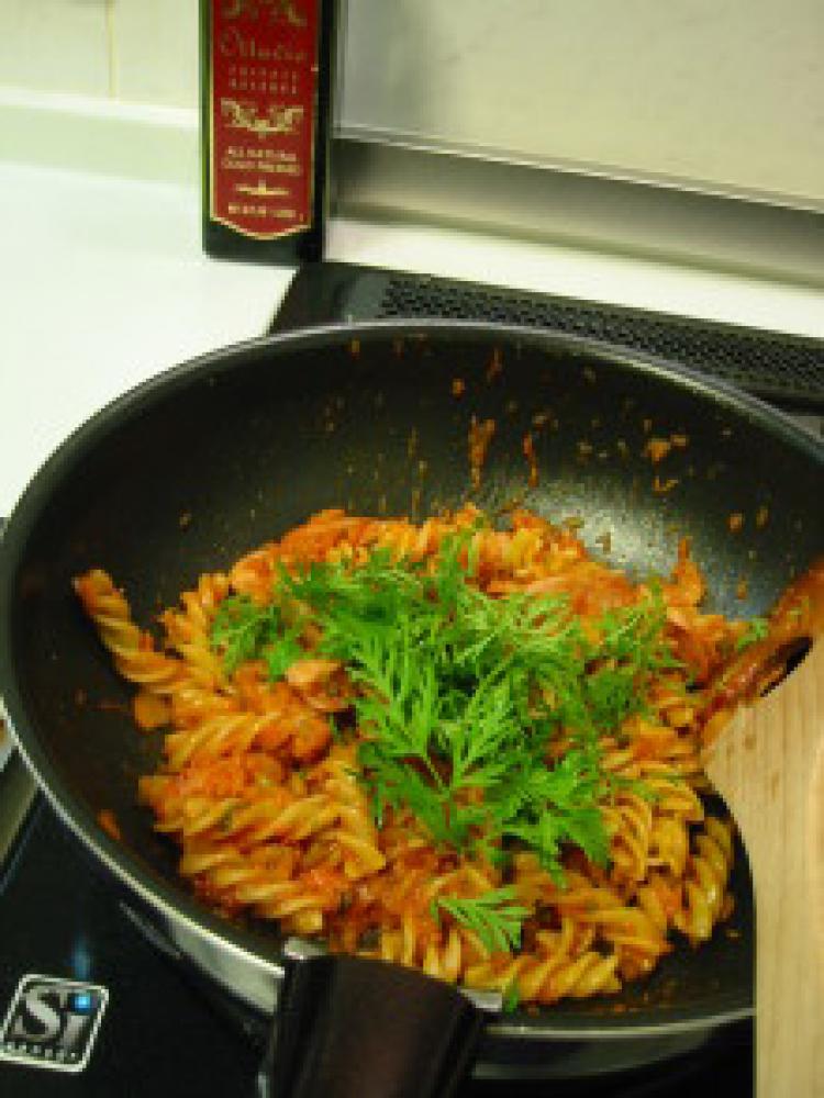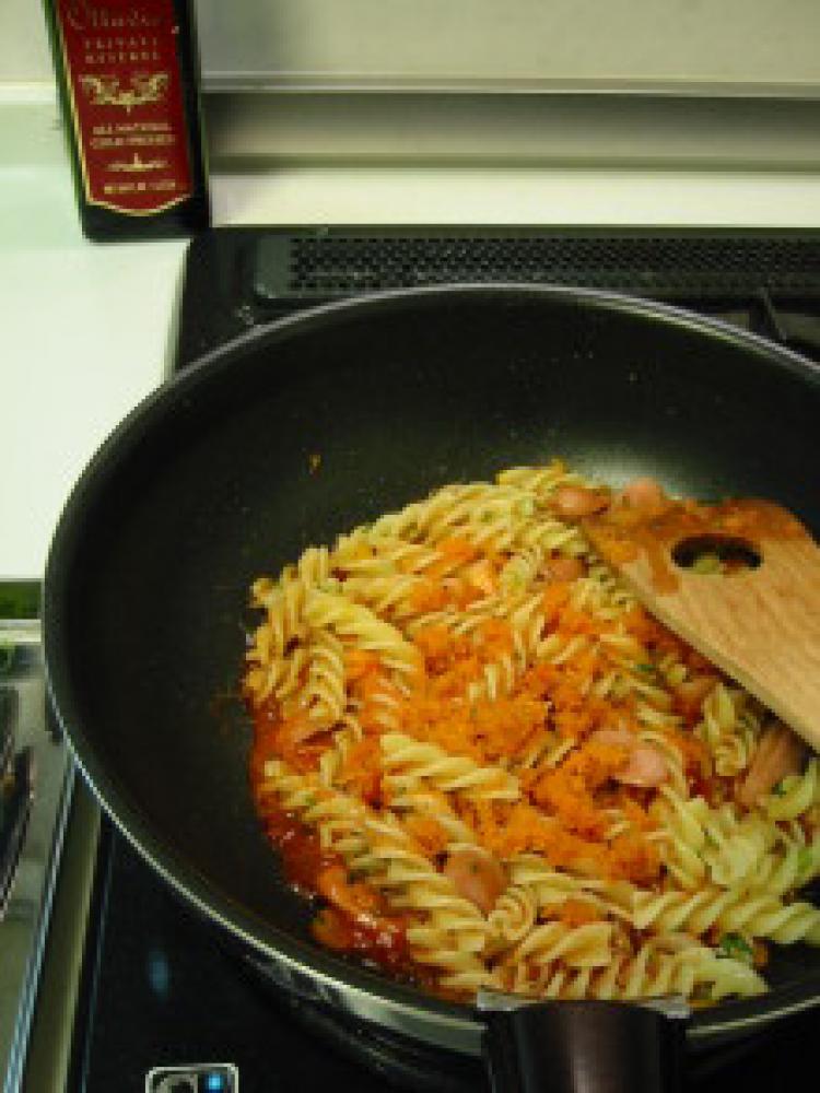 ![]() ③茹であがったパスタを投入し、すりおろしにんじん、トマトジュース、ケチャップを加えて水分を飛ばすようにして炒め合わせる。