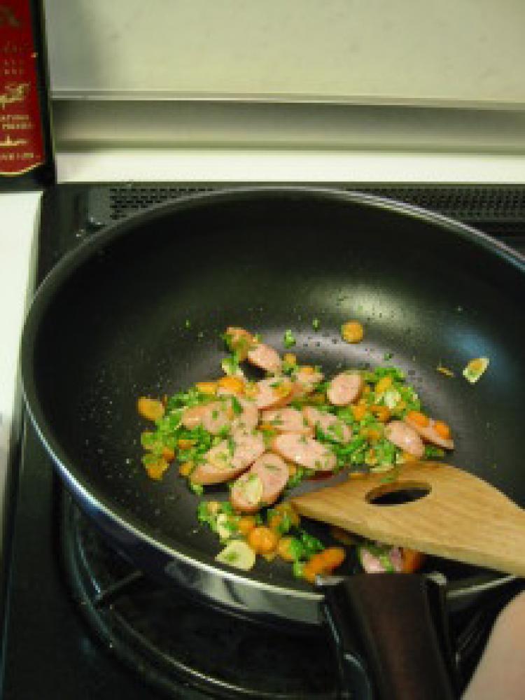 ![]() ②にんにくの香りがしてきたらソーセージ、にんじんの茎を入れて炒め、軽く塩こしょうする。写真はすり残しのニンジン入り。