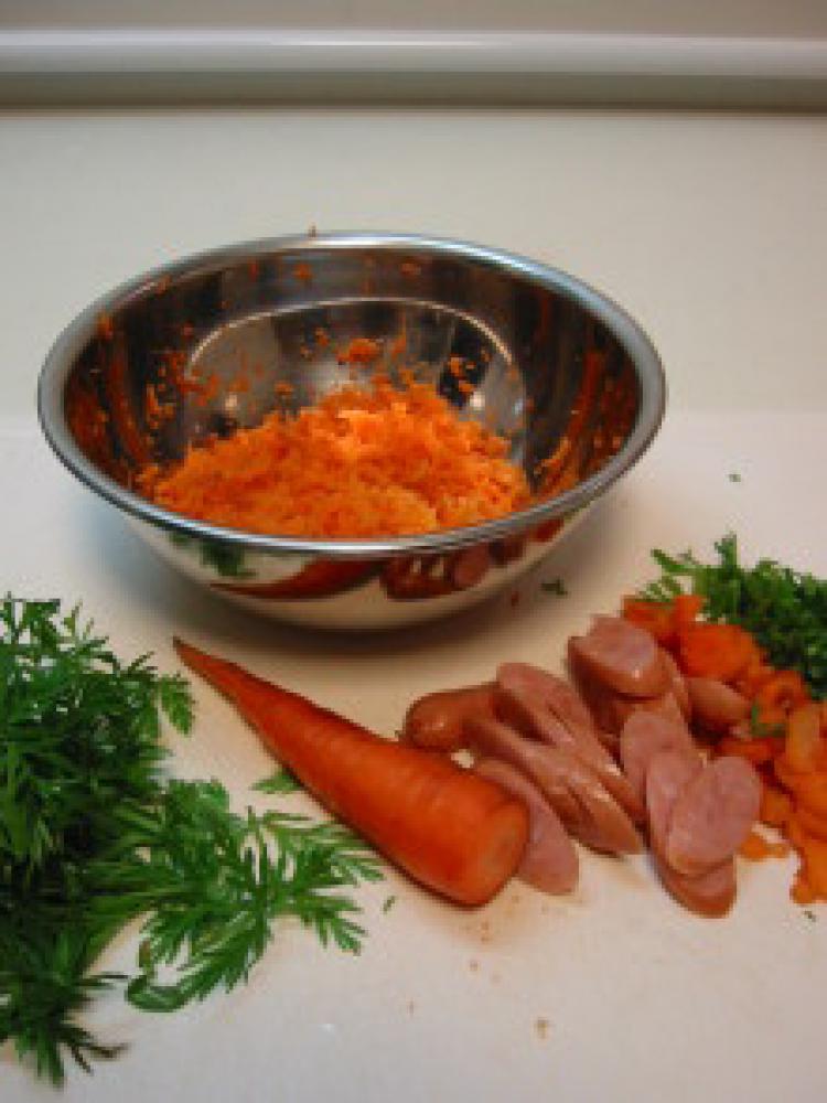 ![]() 下準備①ソーセージは食べやすい大きさに切る。にんじんをすりおろし、ひとつまみの塩とオリーブオイル(分量外)で和える。
