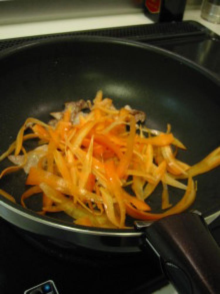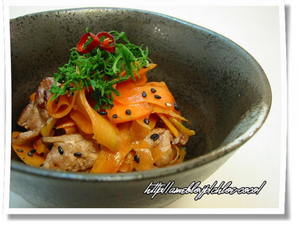 ![]() ① フライパンにごま油を引き強火にかける。豚肉を入れ軽く火が通るまで炒めたら、にんじん、とうがらしを加えて更に炒める。