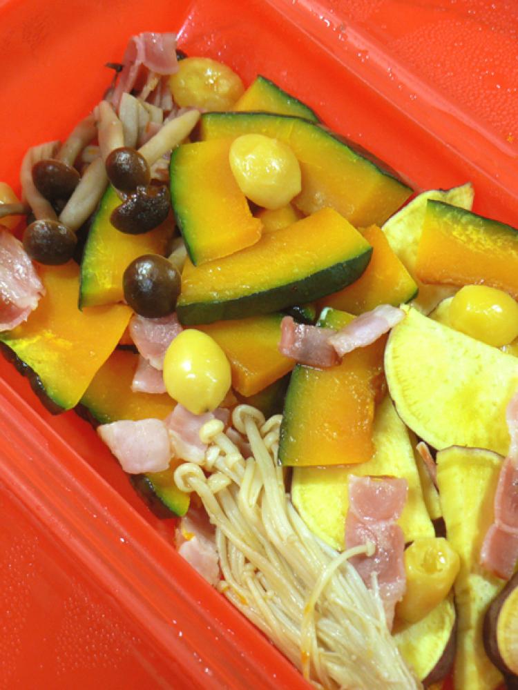 野菜とベーコンは食べやすい大きさに切っておく。さつまいもとかぼちゃは5mmくらいの厚さに。